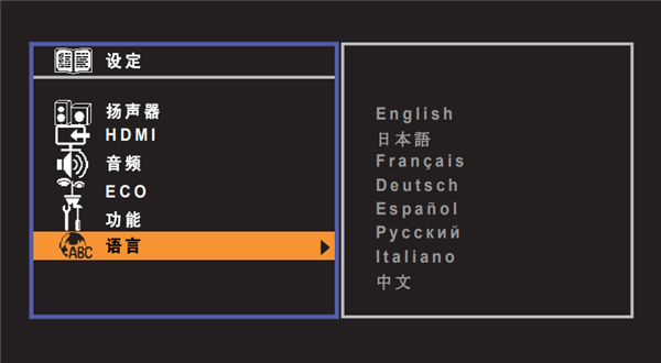 雅马哈HTR-3066家庭影院怎么选择屏幕菜单语言从英语、日语、法语、德语、西班牙语、俄语、意大利语和中文中选择需要的屏幕菜单语言。