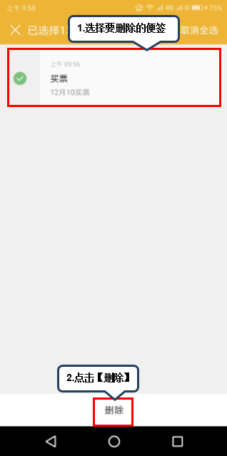 5、长按便签文件,选择已完成的便签后点击【删除】,再点击【删除】可对便签进行删除。