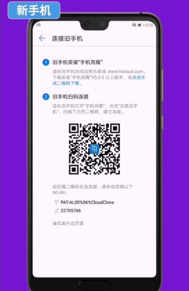 4、在旧手机上,点开️【手机克隆】->️【这是旧手机】,会出来扫描二维码的页面,用旧手机扫描二维码,按照指导,手机连接成功。