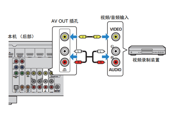 可将视频/音频录制装置连接至 AV OUT 插孔。这些插孔将输出选择为输入的模拟视频/音频信号。