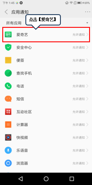 5、点击需要关闭通知的应用,例如点击【爱奇艺】。