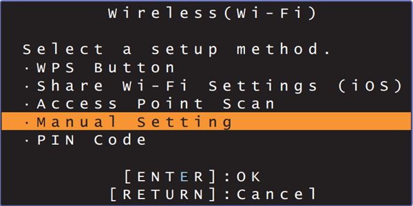6、使用 上/下 键选择 “Wireless (Wi-Fi)”,然后按 ENTER 键。