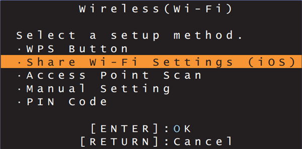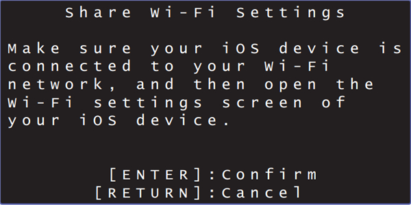 7、使用 上/下 键选择 “Share Wi-Fi Settings (iOS)”,然后按 ENTER 键。