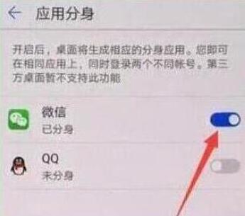 最后点击打开需要双开的应用右侧的开关,以微信为例,点击打开微信右侧的开关,显示已经分身即可。