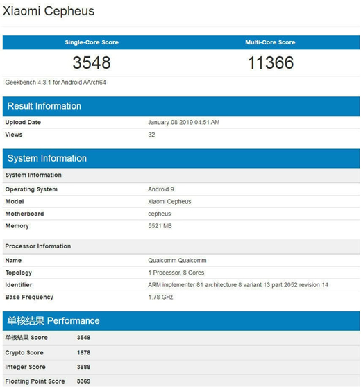 更值得一提的是,目前在Geekbench数据库中出现一款代号为“Cepheus”的小米新机,单核能跑3458分,多核高达11366分,已经是行业顶级水平。