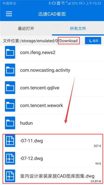 4、切换到所有文件,找到DownloaD文件夹,这里有你下载的文件,找到图纸文件,轻触打开即可。