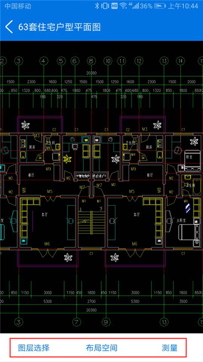 7、打开图纸文件后,用户可以借助于迅捷CAD看图,隐藏/显示图层,设置布局空间,进行距离测量和面积测量。