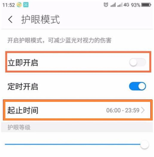 点击进入后点击【立即开启】,可以设置起止时间,这个根据自己的实际情况选择即可,也可以拉动下面的选择护眼等级。