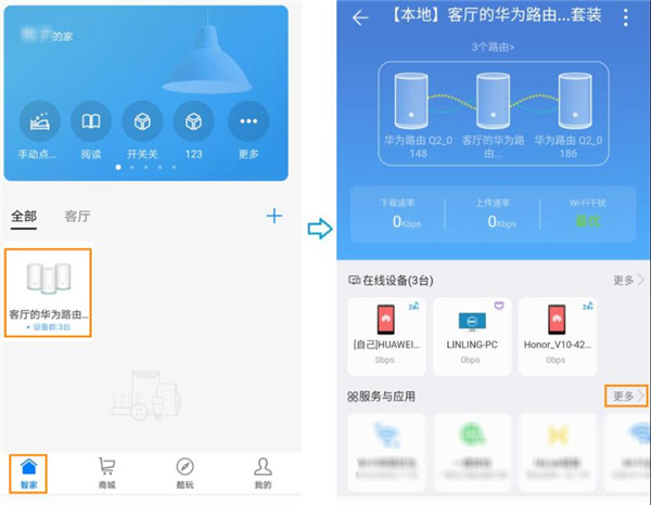 2、在首页“家居”中点击华为a1路由器,进入路由器管理页面。点击服务与应用右侧的“更多”。