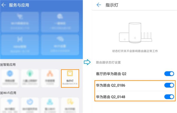 3、在“智能应用”中点击“指示灯"进入详情页,关闭子路由指示灯开关。