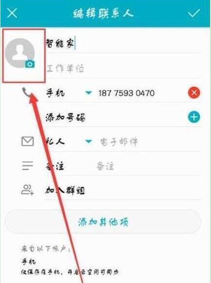 4、进入到【编辑联系人】界面后,点击界面左上角的【头像】图标;在下方显示的菜单中选择【从图库中选择】选项,