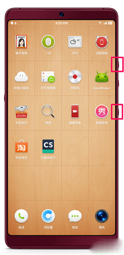 确保锤子手机电量充足以后我们长按电源键和音量上键15秒左右。