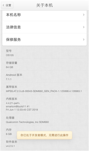 2、点击【关于手机】这一项,我们看到以下界面。我们需要下拉到最后一项【系统版本】连点3次打开【开发者选项】。
