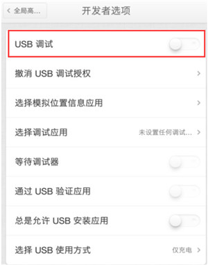 4、我们会看到如下图所示的界面,我们将USB调试项右划开启即可。
