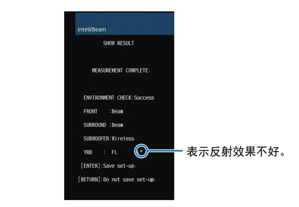 确保声音反射板配置的声道 (FL、 FR、 SL 和 SR)在 SHOW RESULT 屏幕上显示为“YRB”。