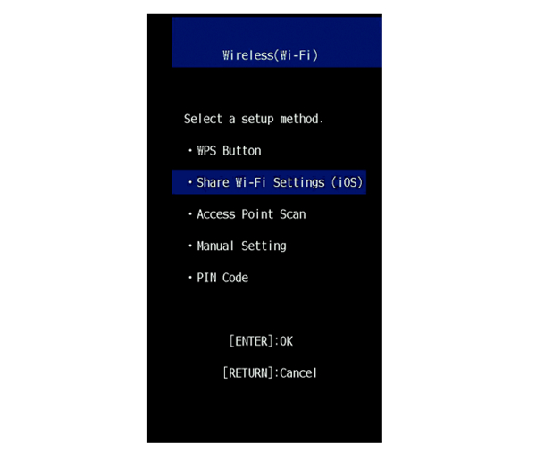 7、使用 上/下 键选择“Share Wi-Fi Settings (iOS)”,然后按 ENTER 键。