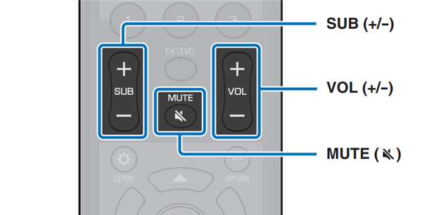 5、按 VOL (+/-) 键调节音量。按 SUB (+/-) 键调节低音炮的音量。