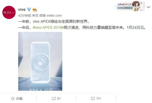 vivoapex2019什么时候发布今天上午,vivo在官方微博放出了新品的预热海报,并配文“至简未来”,这张预热海报也确认此前曝光过的神秘新品为APEX 2019,发布会将在1月24日举行。