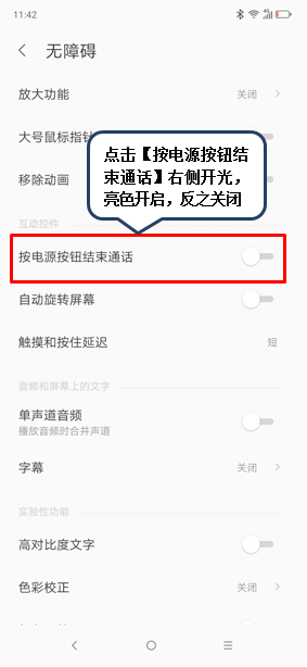 3、点击【按电源按钮结束通话】右侧开关,使之变为亮色即可实现在通话时,按下【电源键】结束通话而不是开启或关闭屏幕。