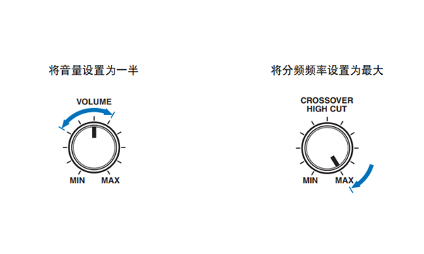 当低音炮连接至本机时,打开低音炮并如下所示设置音量和分频频率。