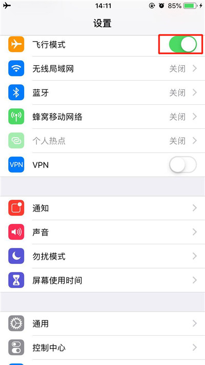 如果屏幕左上角显示有飞机,那就说明我们开启了飞行模式,想要去掉也非常简单,去设置里面关闭飞行模式即可。下面是具体的关闭方法:
