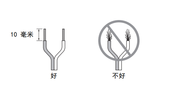 2、从每根扬声器连线的末端处分别去掉一段约10mm长的绝缘层。