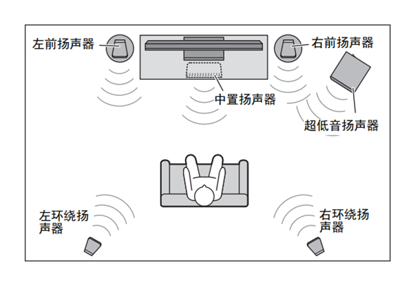 将超低音扬声器放置在右前扬声器或左前扬声器的外侧,如图所示。