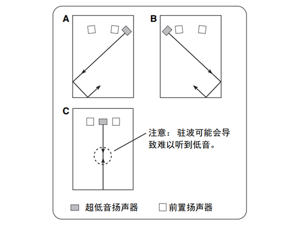 如图C所示的摆放位置也是可以的。但是,如果超低音扬声器直接面对墙壁放置,而聆听位置处于房间中央,则可能无法听到完美的低音效果。这是因为在两面平行的墙壁之间形成了【驻波】,从而会抵消低音音效。为了防止出现这种情况,应使超低音扬声器斜对墙壁放置。有时可能还需要靠墙壁放置书架等等,以此打破平行墙面的完整性。