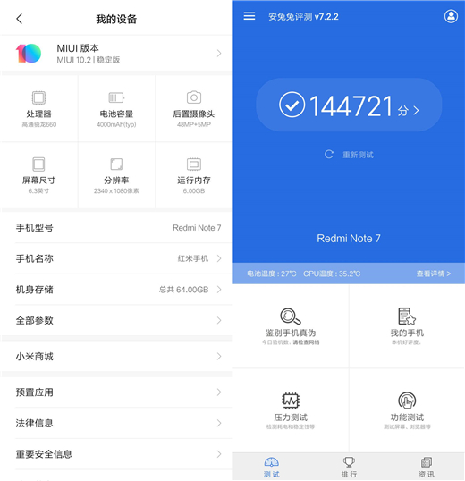 我们也对红米Note7的跑分进行了实测,与发布会上展示的跑分几乎一致,都在14W分以上,整体性能相当不错。