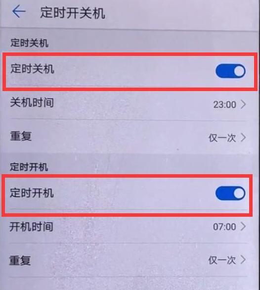 4、点击打开【定时开机】和【定时关机】右侧的开关,然后点击下面的【关机时间】、【开机时间】设置开关机的时间,手机将在设定的时间自动关机或开机。
