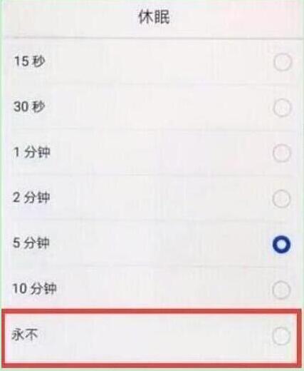 4、在弹出的选项框中点击勾选【永不】即可设置屏幕常亮,勾选其他时间即可在规定时间熄屏。