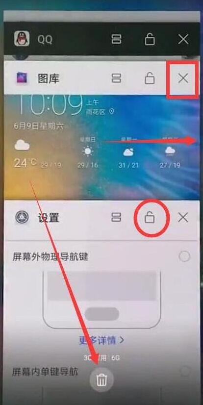 进入后台卡片界面后,右滑应用卡片或者点击左上角的叉可以关闭该应用,点击屏幕下方的垃圾桶图标关闭所有后台应用。