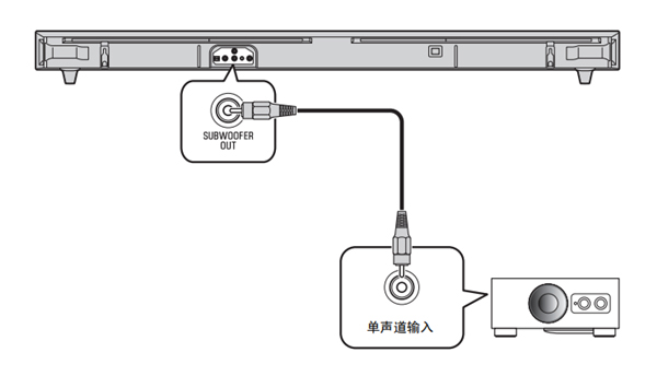 1、用针脚插头缆线将条形音箱连接到外部超低音扬声器。