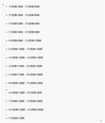 ️②iphone手机的序列号第五位数代表生产周期,第五位数是数字(用1-9表示)和18个字母(26个去掉了A、B、E、I、O、U、A、Z这8个),从1-Y,一共27组,每半年循环一次。如图所示: