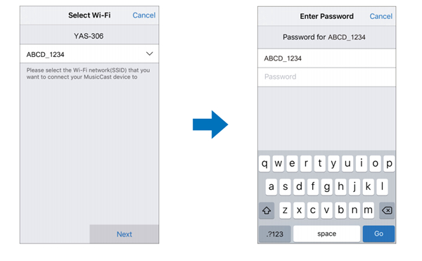 • 当显示例如左下角屏幕时,选择本机需要连接的网络并输入路由器密码 (加密键)。