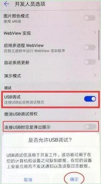 接下来点击打开【USB调试】的开关,还可以点击打开下面的【连接USB时总是弹出提示】的开关,这样手机插上电脑时会自动弹出提示让我们点击打开USB,就不会连接电脑没反应了,打开USB后,在通知栏把【仅充电】改成【管理文件】或者【查看照片】即可连接电脑传输文件了。