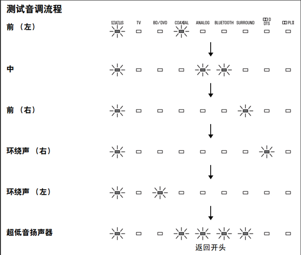 在输出测试音调时, STATUS 指示灯闪烁绿色。测试音调按照以下顺序循环通过各个声道。测试音调从各个声道轮流输出两秒钟。通过指示灯的闪烁,即可确认哪个声道正在播放测试音调。