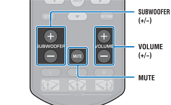 5、按 VOLUME (+/–) 键调节音量。按 SUBWOOFER (+/–) 键调节低音炮的音量。