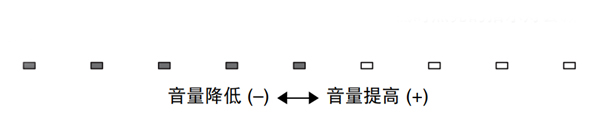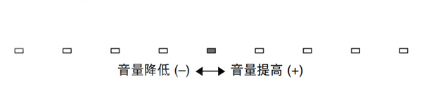 当音量提高时点亮的指示灯向右侧移动,而当音量降低时点亮的指示灯向左侧移动。