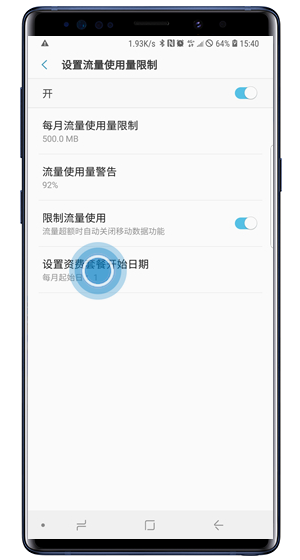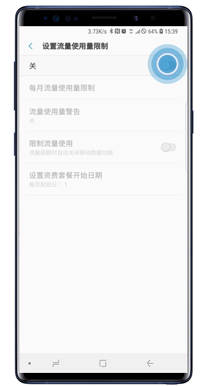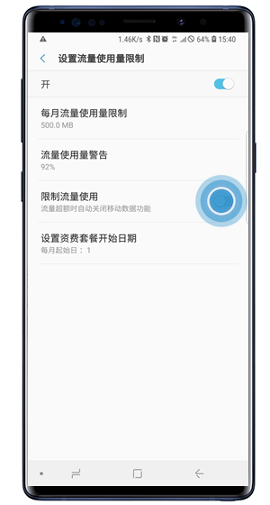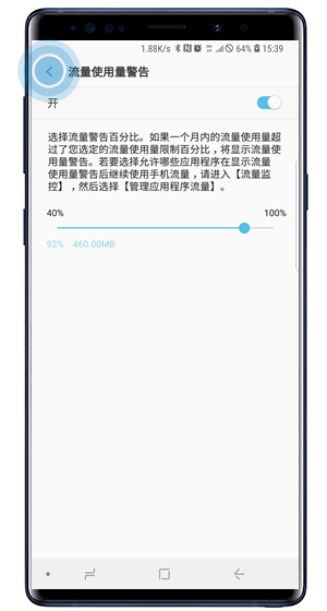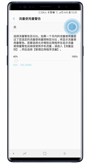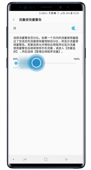 11、向右滑动【滚动球】,设置一个需要的值,设备在达到警告百分比时,将显示流量使用量警告。