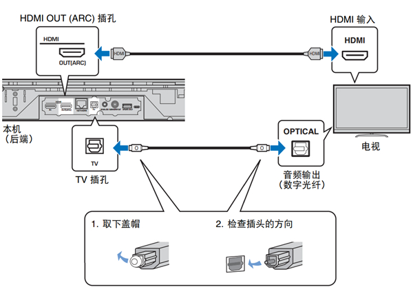 雅马哈YSP-1600回音壁音箱怎么连接电视机将电视机与本机连接,保证输入到本机的视频可以输出到电视中。您还可以在本机上欣赏电视音频的播放。