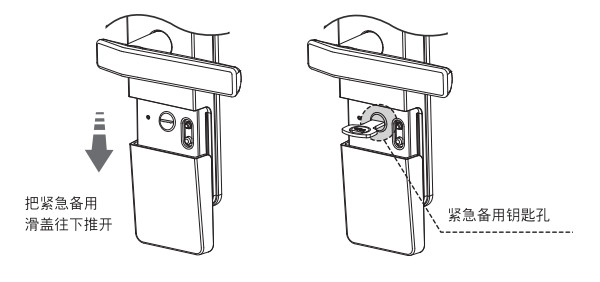 这款锁的钥匙孔设计在指纹锁外面板的下半部滑盖下面,把滑盖滑开就能看到。当指纹锁没电或是出现故障时都可以通过机械钥匙应急开锁先进门,然后再采取解决办法。而机械钥匙开锁的方法也很普通,只要插入钥匙旋转即可开锁。