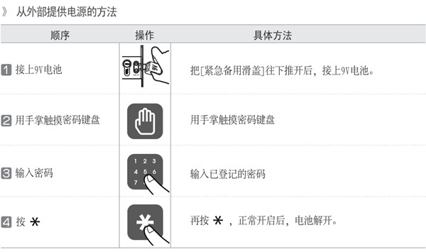 如果您在短时间内拿不到应急钥匙或者没有把钥匙放在房屋外的地方也不用着急,这款锁还有一个应急供电开锁也是很实用的——在附近便利店️购买一个9V应急电池,然后把电池插入指纹锁应急电源接口,待指纹锁重新上电后输入已登记密码,再按【*】键确认即可开锁。