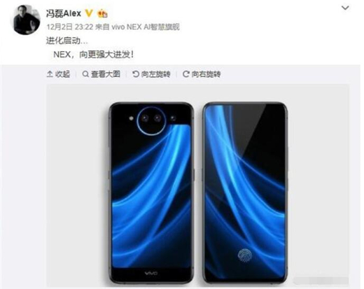 而冯磊放出的这几张照片中,vivonex2背面采用了水平三摄设计,其中两颗摄像头被一个会发光的“月环”圈住,另外一个摄像头和一颗补光灯在“月环”两侧,正面则是一块完整的全面屏,并且支持屏幕指纹。