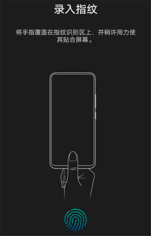 将手指放在屏幕指纹感应器上,然后按压感应器直至振动后抬起手指。使用同一手指的不同区块重复此操作,直到指纹成功录入。