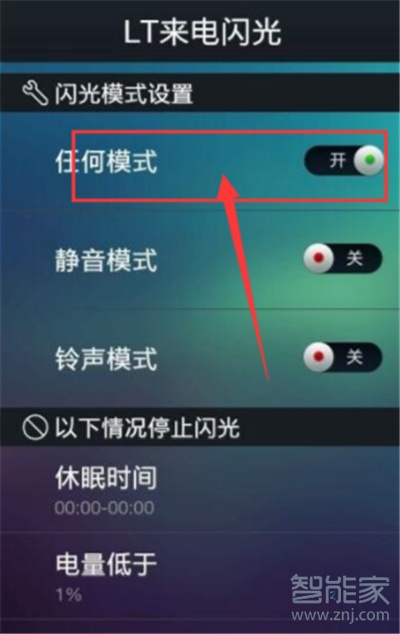 闪光模式:来电闪光软件默认任何模式开启,你也可以设置为“静音模式”开启。