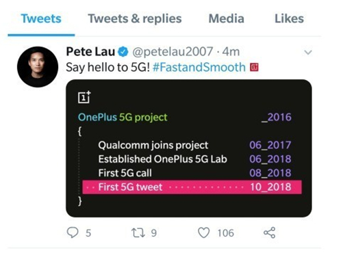 此前,高通在香港举办的5G展会上,宣布了首批5G终端合作的厂商,一加就是其中一员,一加CEO刘作虎还发出了第一条5G推特。