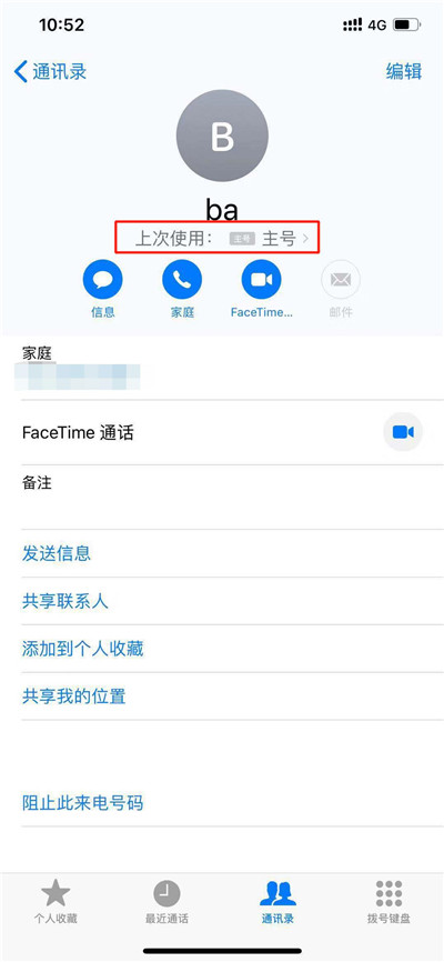 4、进入联系人详情页面之后,点击联系人名字底下的【主号】,如图所示。