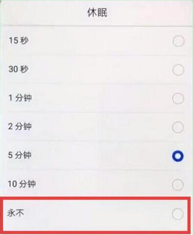 4、在弹出的选项框中点击勾选【永不】即可设置屏幕常亮,勾选其他时间即可在规定时间熄屏。