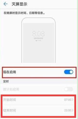 5、最后点击打开立即启用后面的开关即可,我们还可以点击下面的开始时间、结束时间对开始和结束的时间进行设置,这样手机在指定的时间就会自动开启熄屏时钟了。